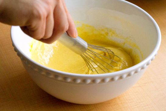 2. Zucker und Mehl mischen. Vanilleschote längs aufschneiden und das Mark herauskratzen. Magerquark, Schlagsahne, Eier, Vanillemark und 150 ml Eierlikör mit einem Schneebesen verrühren. Mehlmischung nach und nach unterrühren.