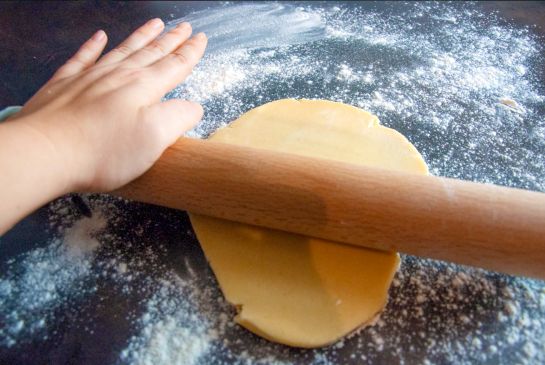 3. Den Backofen auf 180°C Ober-/Unterhitze vorheizen. Den Teig auf einer bemehlten Arbeitsfläche ausrollen. Zum Prägen die Teigoberfläche ebenfalls bemehlen und die Prägerolle mit leichtem Druck von der Mitte nach außen über den Teig rollen. Anschließend die Plätzchen mit Formen nach Wunsch ausstechen und auf ein mit Backpapier belegtes Blech legen. Für ca. 10 Min. (evtl. etwas länger) im Ofen goldbraun backen und anschließend auf einem Gitter abkühlen lassen.