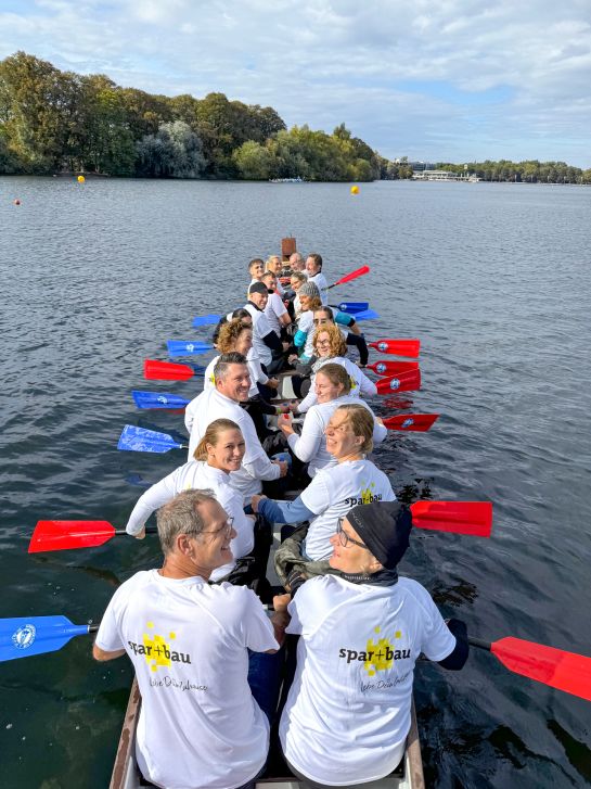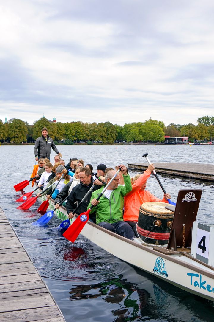An Bord waren 18 Kolleginnen und Kollegen aus unterschiedlichen Abteilungen. Vorstand Rainer Detjen wollte eigentlich nur zum Anfeuern kommen und hat sich nach kurzer Überredung breitschlagen lassen, mit ins Boot zu steigen, da ein Paddler kurzfristig ausgefallen war. Als passionierter Hobbysegler brachte er viel sportlichen Ehrgeiz mit. Doch der sei nur ein Teil des Drachenboot-Erlebnisses. „Es geht hier in erster Linie ums Mitmachen und um den Spaß am Rennen“, erklärte er fröhlich.